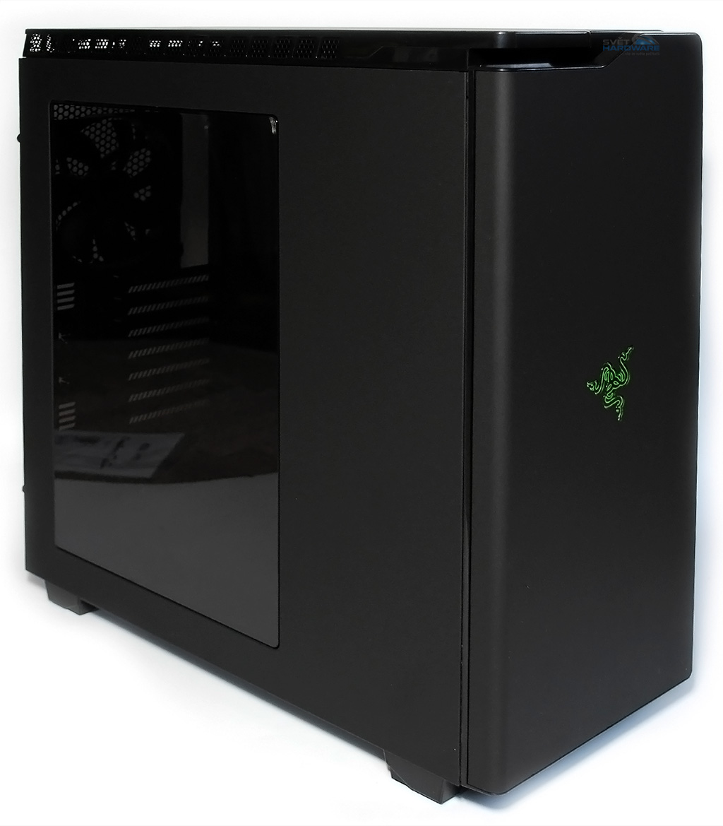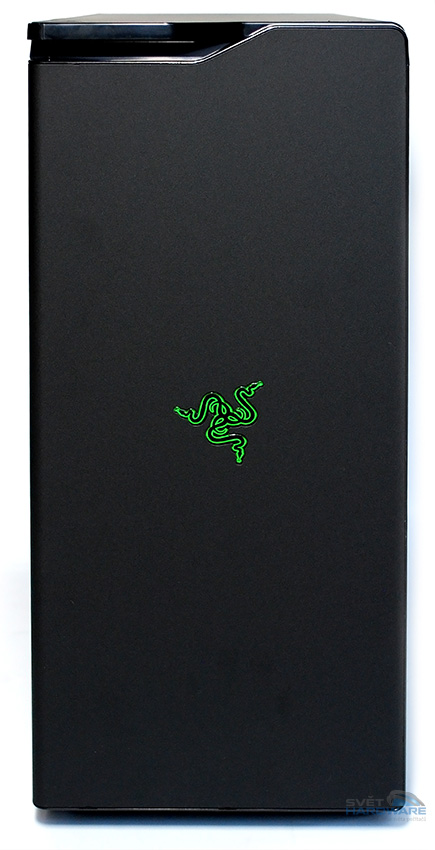 Skříň už od pohledu působí robustně a střídmě, i když její design se plně projeví až poté, co počítač zapneme, kdy se rozsvítí její LED. Ty jsou umístěny všude možně, třeba hned v předním panelu pod logem firmy Razer a jde v každém případě pochopitelně o zelené LED. Tento přední panel může vypadat jako dvířka, ale ve skutečnosti tu žádné panty nejsou. Můžeme jej tak od zbytku skříně jen odtrhnout, abychom se dostali k prachovému filtru a předním ventilátorům (viz další kapitola). Kudy tedy bude k nim proudit vzduch? Jako obvykle to bude skrz boční průduchy, ale jak brzy uvidíte, výrobce se z nějakého důvodu rozhodl dát průduchy pouze na jednu stranu předního panelu (plus je tu tedy ještě jako obvykle spodní otvor).
