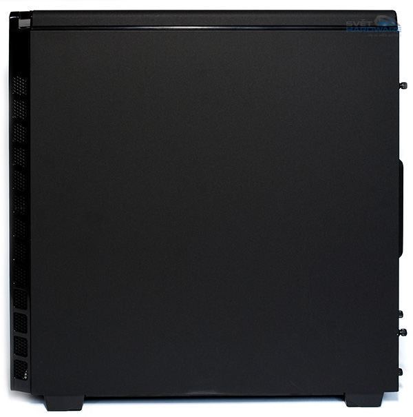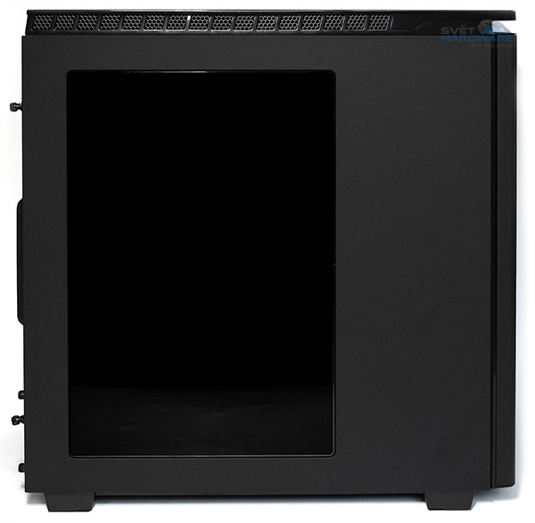 Z pravé strany tedy už jsou vidět průduchy v boku předního panelu, kudy tedy bude muset proudit velké množství vzduchu, pokud se rozhodneme nechat zapnuté všechny tři přední 120mm ventilátory, jež dostaneme v základním balení. Bočnice jsou klasicky zasunovací a jištěné zezadu pomocí přítlačných šroubků, na něž si tedy budete muset nejdříve vzít šroubovák. Jsou totiž velmi utaženy a jejich závity nejsou protaženy.