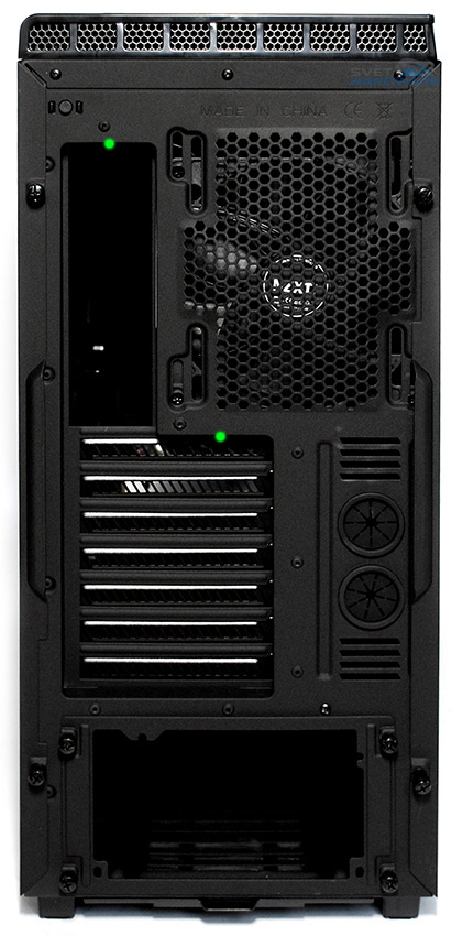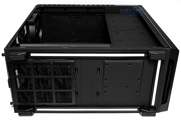 Záslepek rozšiřujících karet tu máme jako obvykle sedm, z nichž každá je vybavena průduchy a místo vedle nich bylo využito pro umístění velkých krytých otvorů pro hadičky vodního chlazení, nebo prostě cokoliv, co potřebujeme protáhnout skrz zadní panel. Spodní pozice napájecího zdroje je vybavena zadním rámečkem přidržovaným čtyřmi přítlačnými šroubky. Z toho lze usuzovat, že zdroj budeme dovnitř cpát právě skrz zadní panel a jinudy to nebude možné. Zpod skříně také vykukuje packa patřící prachovému filtru u spodního nasávání.