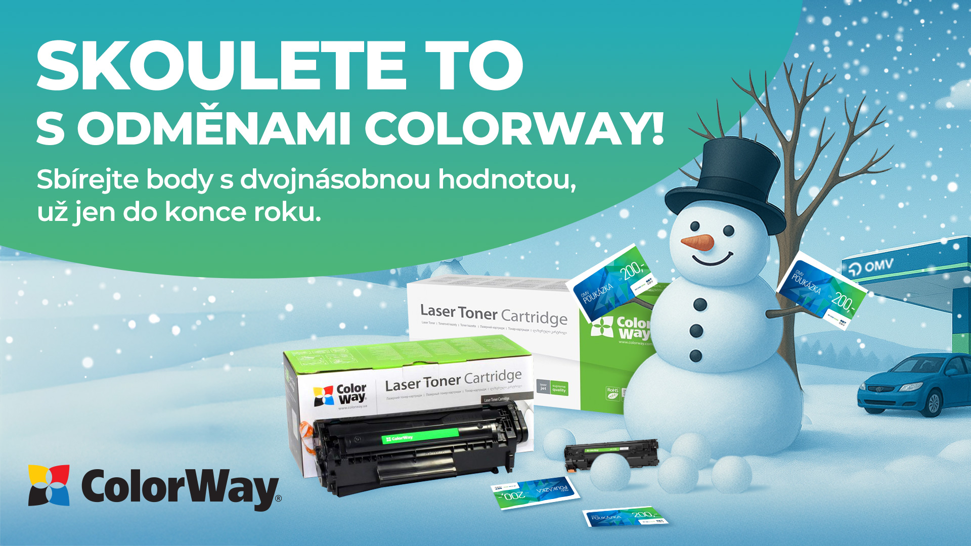 Naše celoroční akce s ColorWay se pomalu blíží ke konci. Už jen do konce roku, tedy do 31. 12. 2025, můžete za každý koupený toner ColorWay sbírát body, které vám pak vyměníme za poukaz na pohonné hmoty od OMV. Nákupem praktického příslušenství pro své zákazníky tak získáte velmi užitečnou odměnu i sami pro sebe. Od 1. 9. 2025 navíc vaše cesta k poukazům OMV utíká ještě rychleji, protože právě od tohoto data jsme zvýšili hodnotu jednoho bodu z 10 Kč na 20 Kč. Tato změna se týká všech bodů nasbíraných až po datu 1. 9. 2025. Hodnota dříve nasbíraných bodů se tedy nemění.